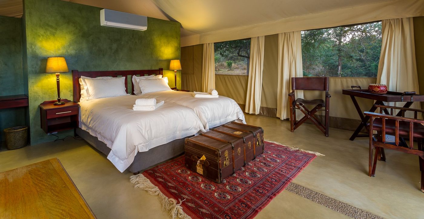 På glamping på Nyati Safari Lodge bor du i något av våra exklusiva Rhino-tält med rinnande vatten, riktiga sängar och moderna bekvämligheter. Taket och väggarna är gjorda av kraftig tältduk som låter naturens egna ljud tränga in, så här får du en maximal safariupplevelse.