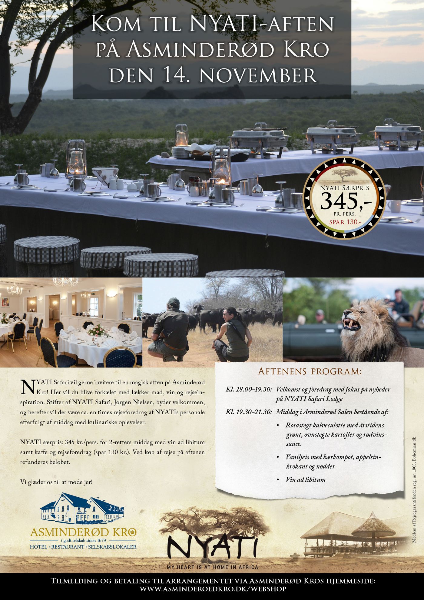 Nu kan du anmäla dig till en magisk kväll på Asminderød Kro tillsammans med NYATI Safari den 14 november! Här kan du njuta av god mat och goda viner och få massor av inspiration till din nästa Afrikaresa. NYATI Safaris grundare Jørgen Nielsen hälsar välkomna, och därefter håller NYATIs medarbetare ett reseföredrag på cirka en timme, följt av middag med kulinariska upplevelser. Under föredraget berättar vi om några av nyheterna på NYATI Safari Lodge och lite om våra andra resmål i södra Afrika. Vi rekommenderar nämligen alla våra gäster att kombinera sin lyxsafari med andra upplevelser när man ändå är i Sydafrika. Vi kommer också att berätta om vårt stora safariprogram i Krugerparken, som bl.a. inkluderar två safariturer varje dag.