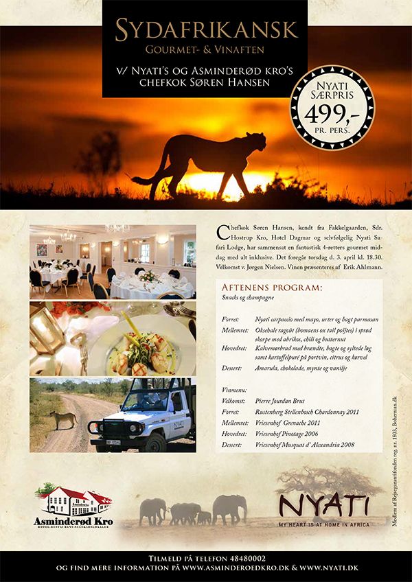 För första gången går det nu att få en försmak av den kulinariska safariupplevelsen på NYATI Safari Lodge. Ägaren till NYATI Safari Lodge, Jørgen Nielsen, bjuder in till sydafrikansk gourmetkväll på Asminderød Kro tillsammans med chefskock Søren Hansen, som är känd från Fakkelgaarden, Sdr. Hostrup Kro, Hotel Dagmar och naturligtvis Nyati Safari Lodge. Här serveras en fyrarätters gourmetmeny med utvalda signaturrätter från Nyati Safari Lodge. Som på safarilodgen finns även en sydafrikansk vinmeny som satts samman av Erik Ahlmann.